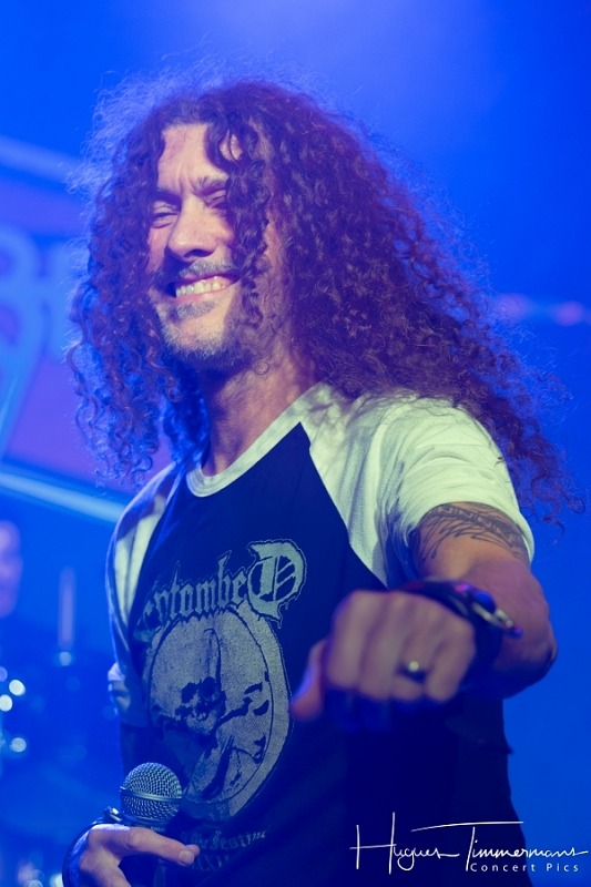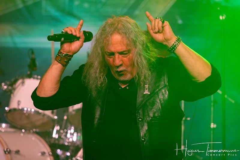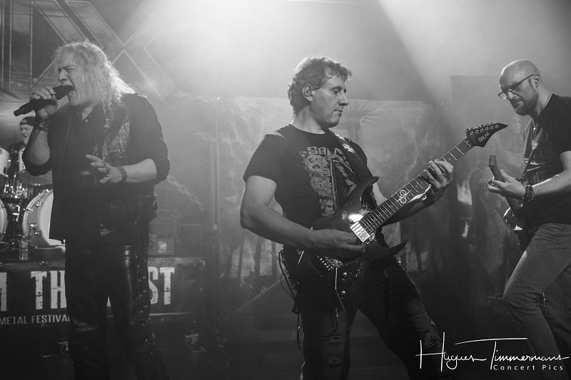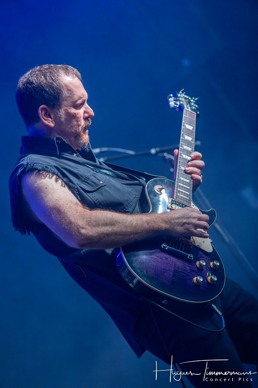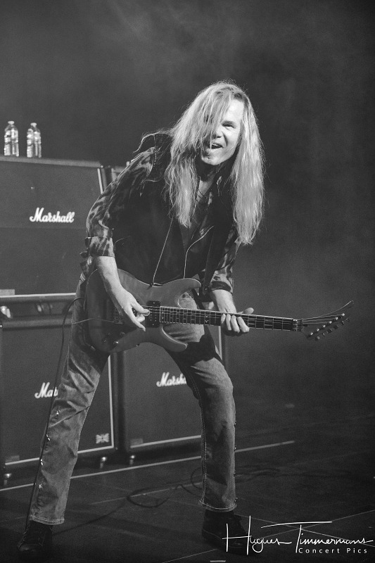 On passe ensuite à du plus lourd avec le groupe français ADX. Juste avant le début du set, les photographes apprennent qu’ils n’ont pas le droit d’aller dans le pit. Grâce à l’intervention des organisateurs, le problème est vite réglé. Mais revenons-en à l’essence même de cette journée: la musique. L’abréviation dont le groupe a tiré son nom provient de l’univers de la métallurgie et signifie « acier doux », symbolisant à la fois le côté dur du heavy metal et le côté doux de leurs mélodies. Le groupe a choisi de défendre ses textes dans la langue de Molière, avec un chanteur dont la voix n’est pas sans rappeler celle du tôlier… Le son d’ADX est assez compact et la rythmique plutôt rapide. Belle énergie grâce à des guitares très véloces. Le public connaît le répertoire des Français et ne se fait pas prier pour participer tout au long de la setlist, composée d’une dizaine de morceaux choisis dans l’abondante discographie du groupe.