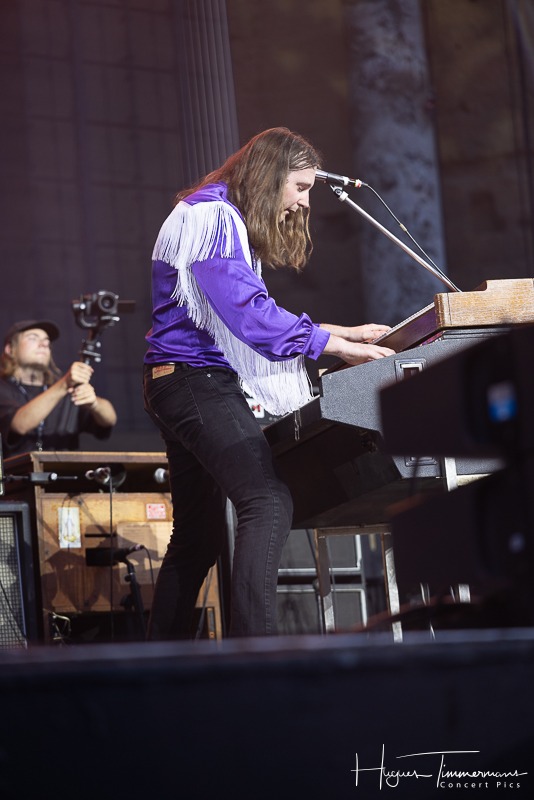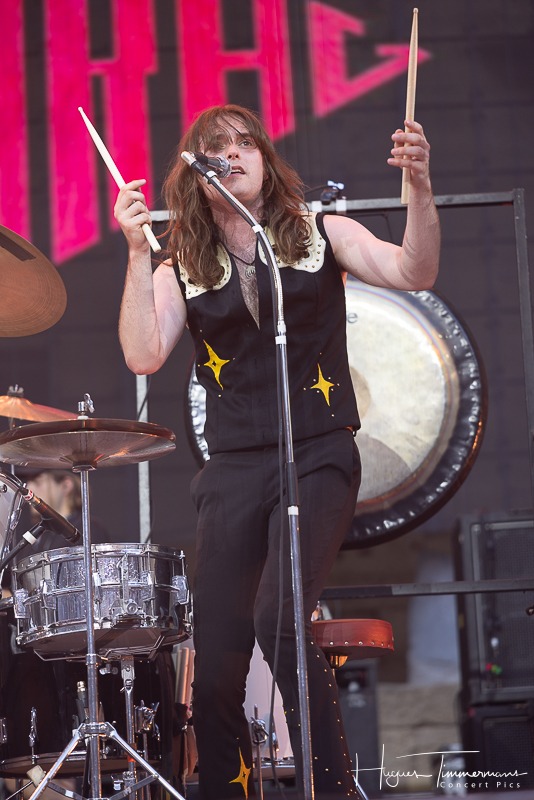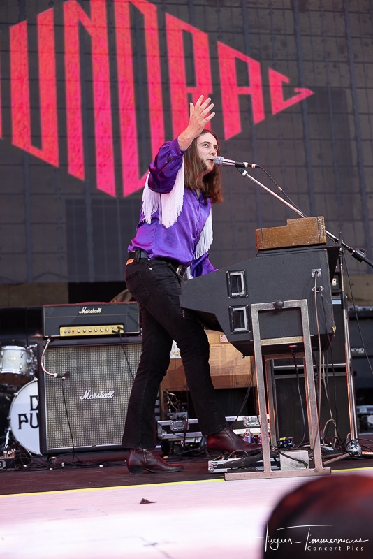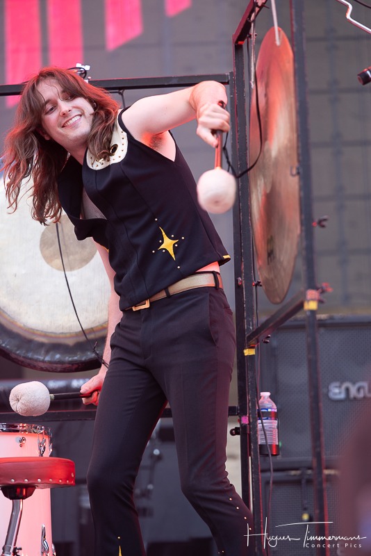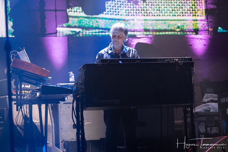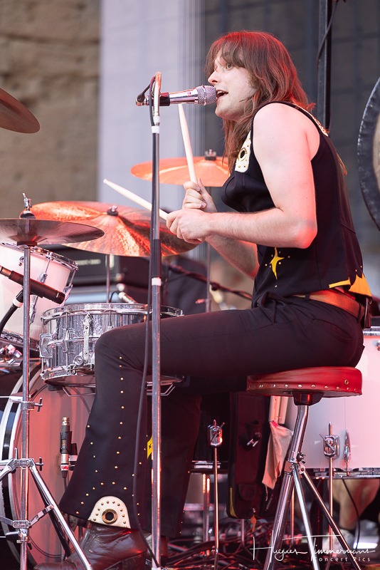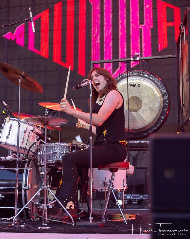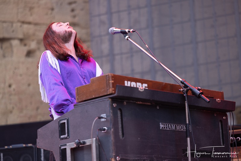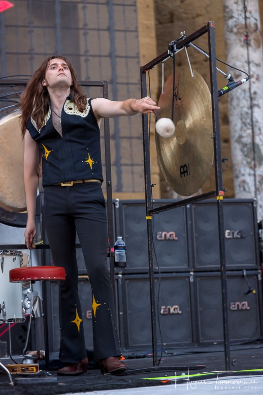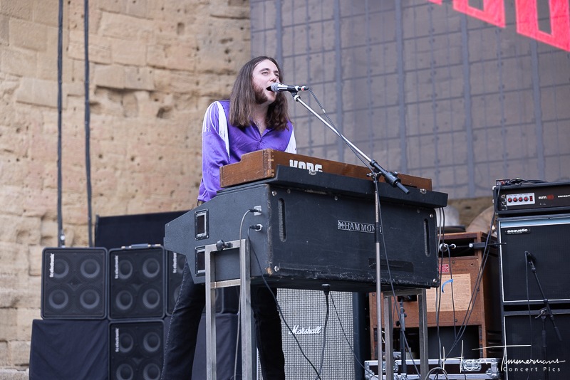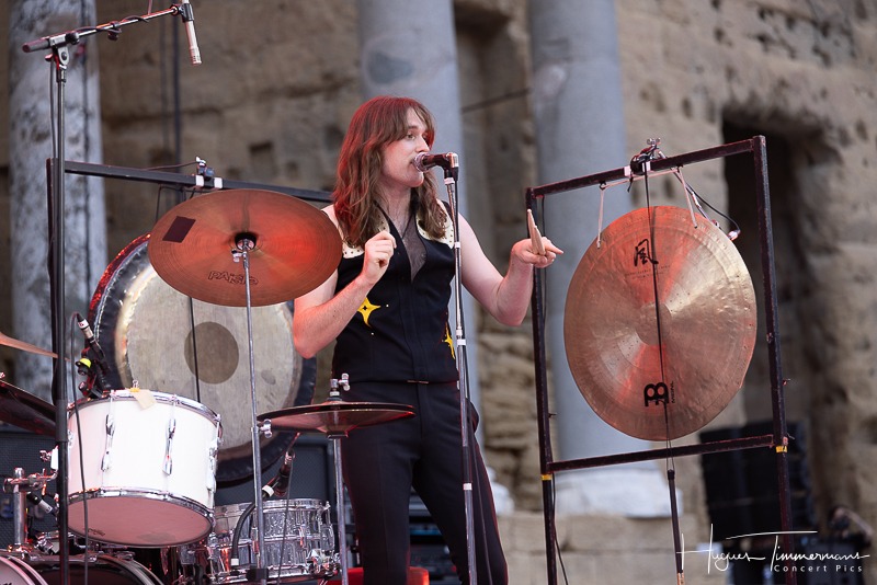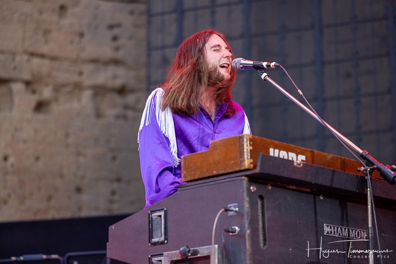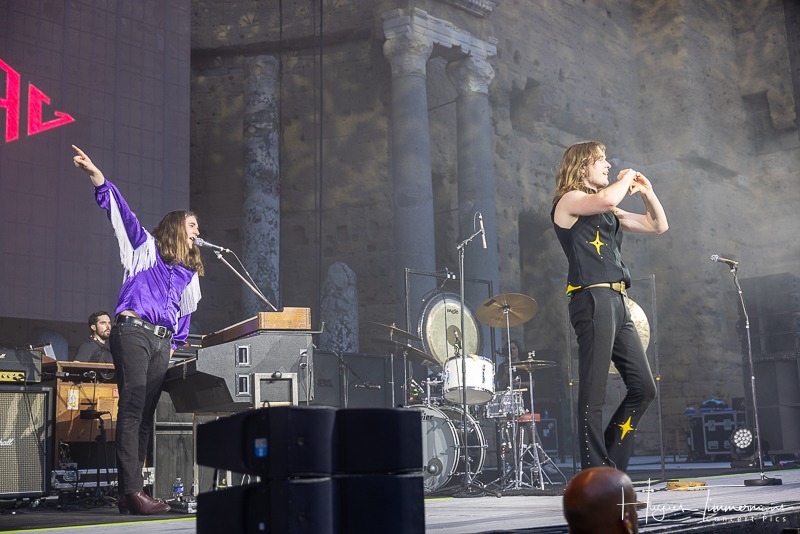Dans l’enceinte du Théâtre antique, les gradins et le parterre se remplissement progressivement jusqu’à atteindre une jauge quasi complète dans la soirée. Le public venu nombreux va cependant encore devoir patienter un peu en découvrant Moundrag, un duo français originaire de Paimpol en Bretagne. Sur scène, un orgue Hammond et une batterie entourée de deux énormes gongs. Les deux frères (Camille et Colin Gœllaën-Duvivier) font une joyeuse entrée, visiblement heureux et fiers de jouer en première partie de leurs idoles. Rien qu’à les voir, on sent qu’ils sont fans de rock progressif et psychédélique. Il faut dire que la formule est assez rare puisqu’ils chantent tous les deux accompagnés d’une batterie et de claviers vintage. Musicalement, ils font découvrir au public orangeais un univers hard prog à connotations psych inspiré par un univers de science-fiction très marqué 70’s mis en lien avec la réalité actuelle.