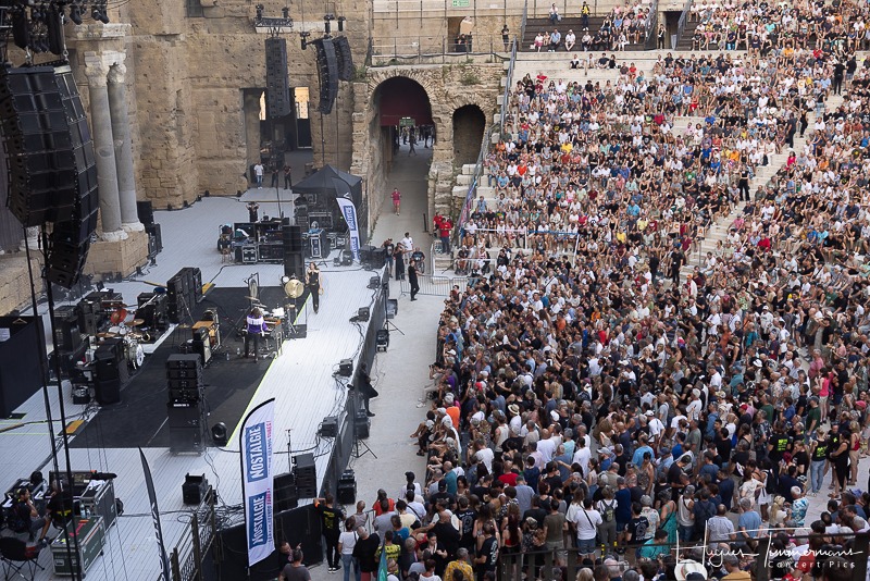 Écrasée sous un soleil de plomb, la ville d’Orange est en proie à une belle agitation en fin de journée de ce mardi 30 juillet 2024. La cause? Un concert qui s’annonce mémorable puisque ce soir, ce sont des titans de la musique rock qui se produiront tels des gladiateurs dans le Théâtre antique d’Orange. À l’ouverture des portes à 19h, une longue file de fans s’étire dans les rues adjacentes dans une lente procession vers le temple de la musique pour cette chaude soirée.
