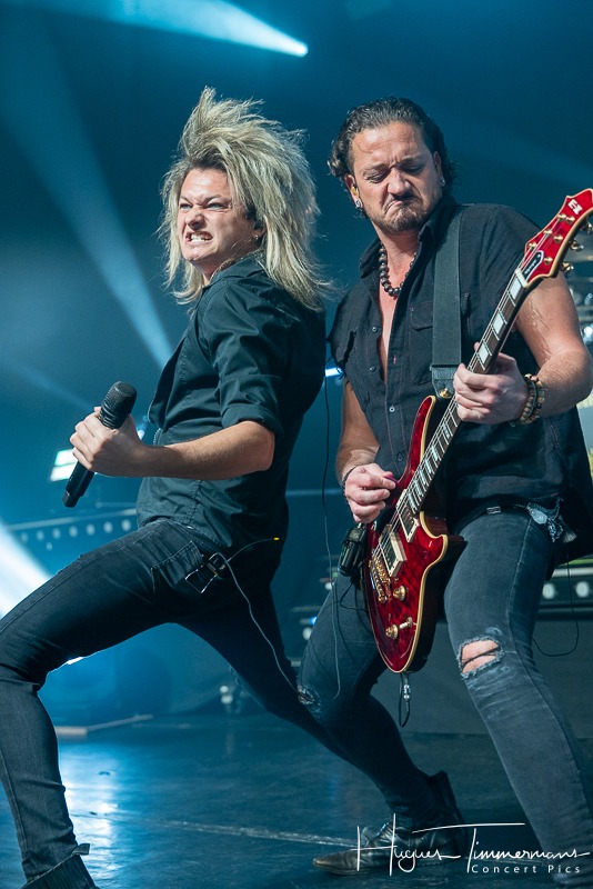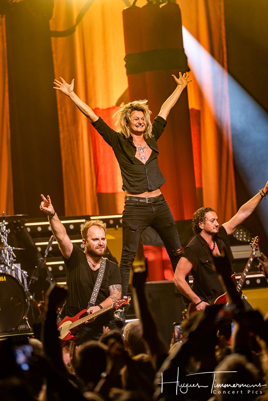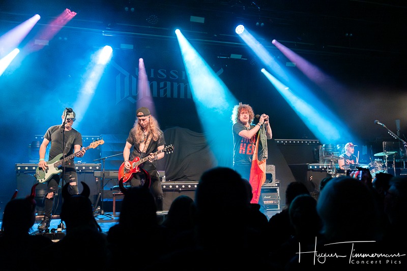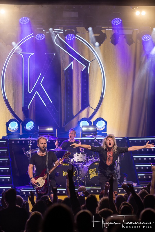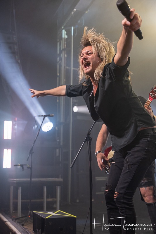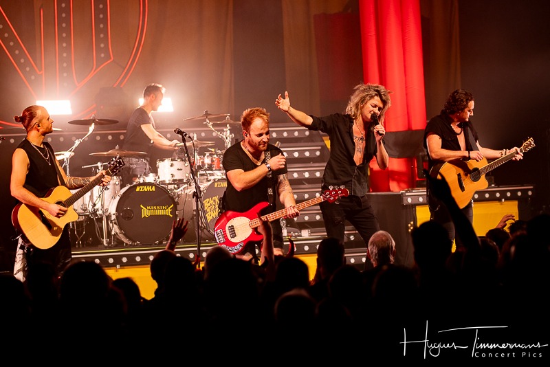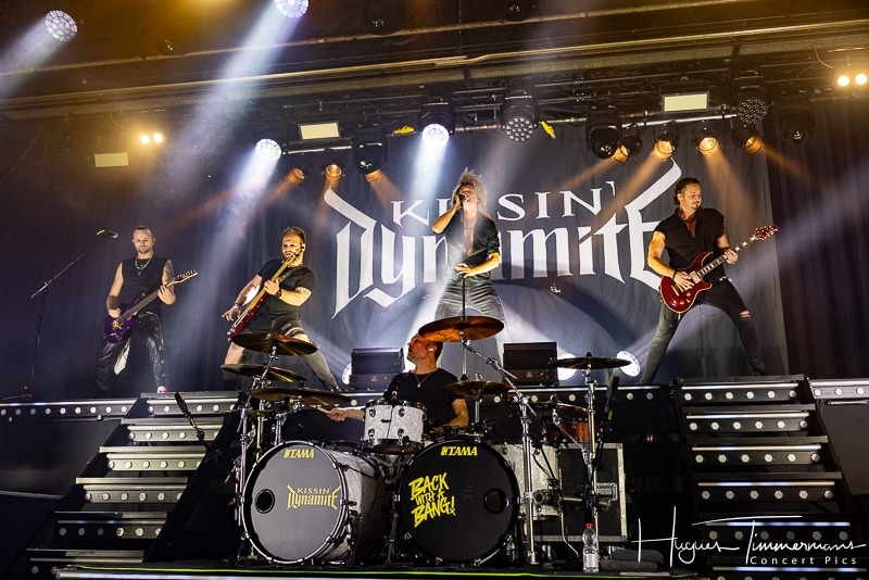 Une brève pause pour boire une bière et nous remettre de nos émotions et l’aventure continue avec les héros de la soirée: Kissin’ Dynamite. Pour le coup, la formation originaire de la Souabe en Allemagne n’est pas inconnue au bataillon puisque nous les avons découverts en 2009 lors d’un festival à Andernach où le jeune groupe (fondé en 2007 après avoir joué du blues pendant trois ans sous le nom de Blues Kids) assurait la promotion de son premier album « Steel of Swabia » sorti en 2008, sur la même scène que des géants comme Axxis, Doro, Udo ou encore Gotthard. Nous les avons ensuite revus aux Pays-Bas en 2012 sur la tournée de promotion de leur 3e album (« Money, Sex and Power« ) qui succédait à « Addicted to Metal » (2010). Les albums se sont ensuite succédé avec « Megalomania » en 2014, « Generation Goodbye » en 2016 et « Ecstasy » en 2018. C’est d’ailleurs en 2019, quelques mois avant le début de la pandémie que nous les avions vus pour la dernière fois, c’était à l’Aéronef à Lille. Ont encore suivi « Not the End of the Road » en 2022 (qui s’est hissé à la 2e place des charts allemands) et le tout récent « Back With A Bang » sorti en juillet dernier. Autant dire que nous étions impatients de retrouver le groupe sur scène. Quel bonheur de les accueillir en Belgique.