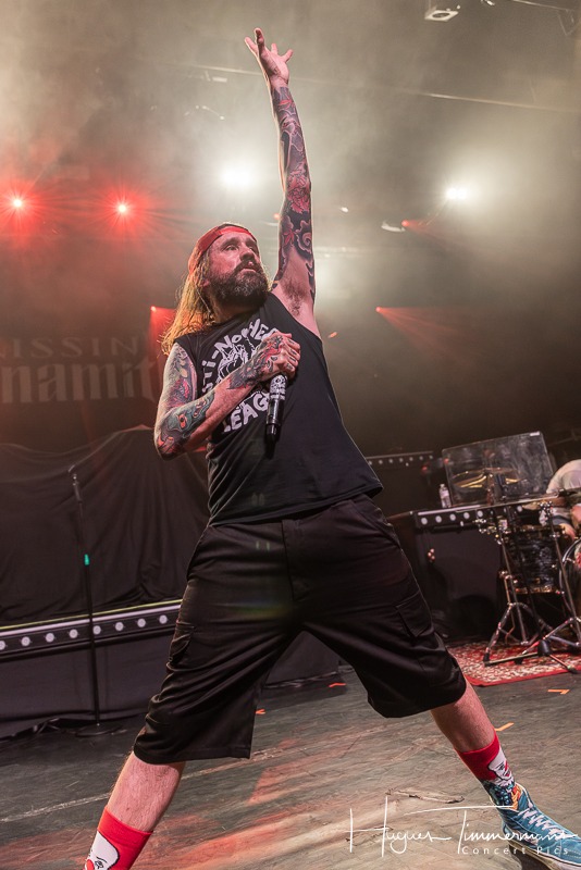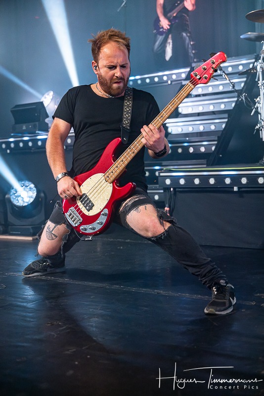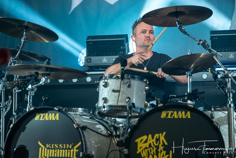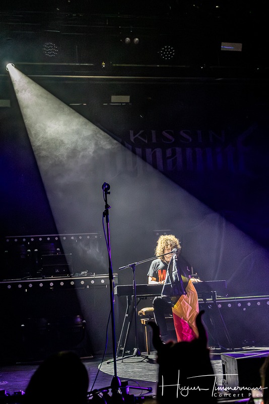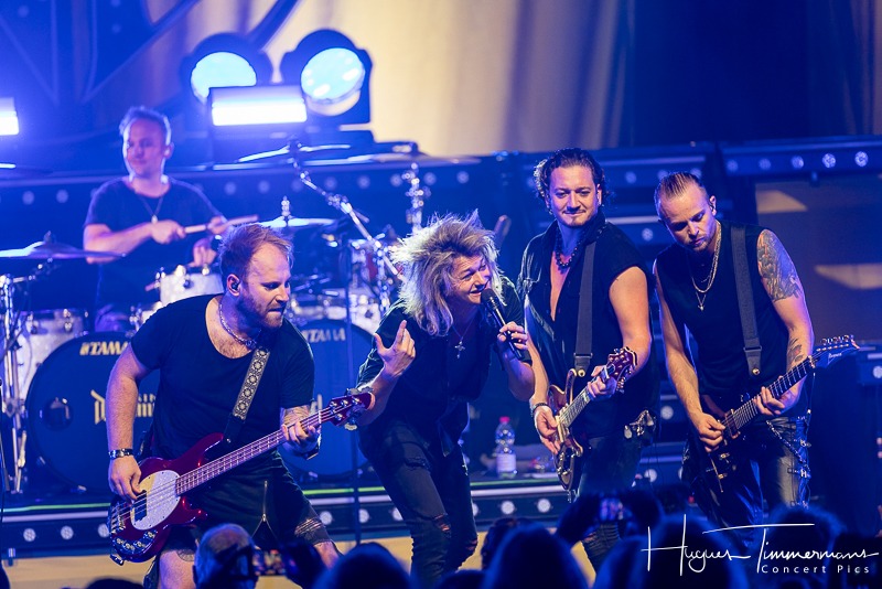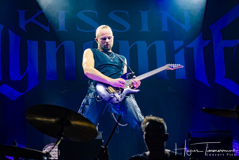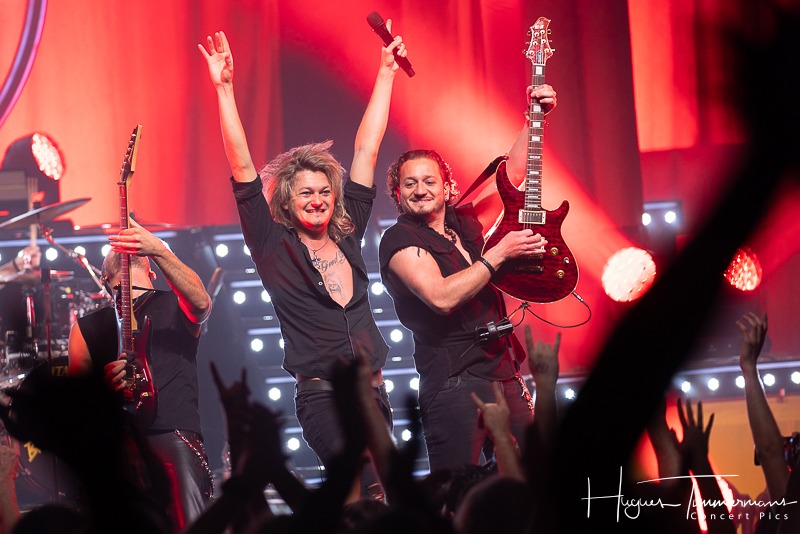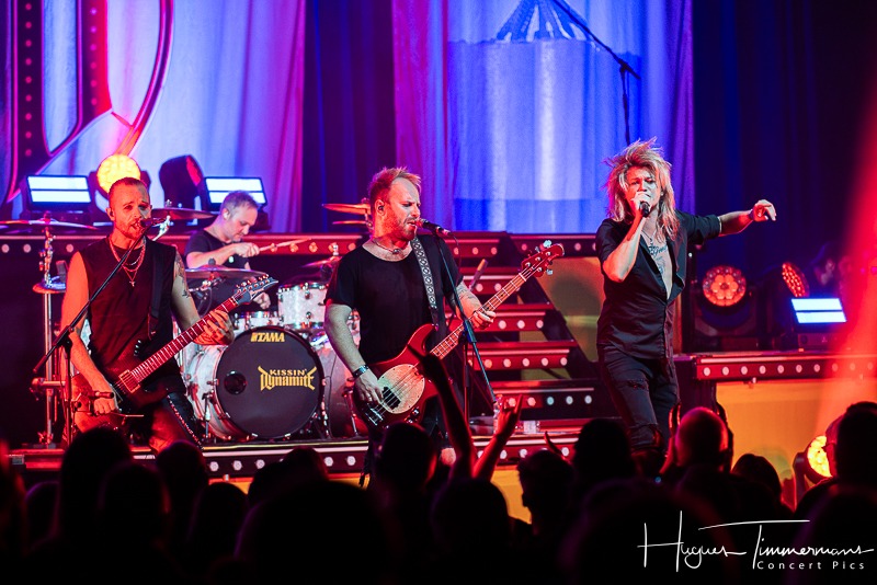 Une brève pause pour boire une bière et nous remettre de nos émotions et l’aventure continue avec les héros de la soirée: Kissin’ Dynamite. Pour le coup, la formation originaire de la Souabe en Allemagne n’est pas inconnue au bataillon puisque nous les avons découverts en 2009 lors d’un festival à Andernach où le jeune groupe (fondé en 2007 après avoir joué du blues pendant trois ans sous le nom de Blues Kids) assurait la promotion de son premier album « Steel of Swabia » sorti en 2008, sur la même scène que des géants comme Axxis, Doro, Udo ou encore Gotthard. Nous les avons ensuite revus aux Pays-Bas en 2012 sur la tournée de promotion de leur 3e album (« Money, Sex and Power« ) qui succédait à « Addicted to Metal » (2010). Les albums se sont ensuite succédé avec « Megalomania » en 2014, « Generation Goodbye » en 2016 et « Ecstasy » en 2018. C’est d’ailleurs en 2019, quelques mois avant le début de la pandémie que nous les avions vus pour la dernière fois, c’était à l’Aéronef à Lille. Ont encore suivi « Not the End of the Road » en 2022 (qui s’est hissé à la 2e place des charts allemands) et le tout récent « Back With A Bang » sorti en juillet dernier. Autant dire que nous étions impatients de retrouver le groupe sur scène. Quel bonheur de les accueillir en Belgique.