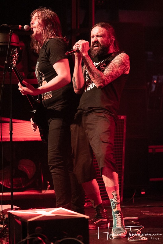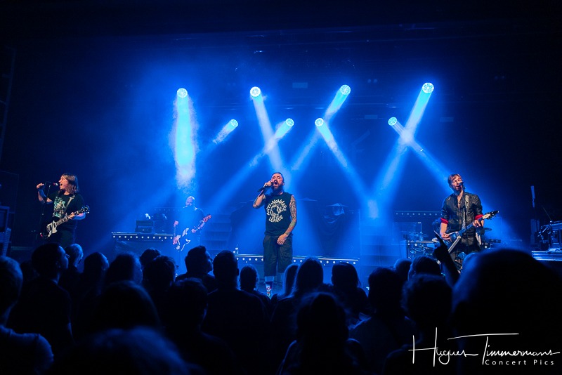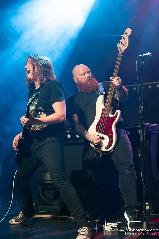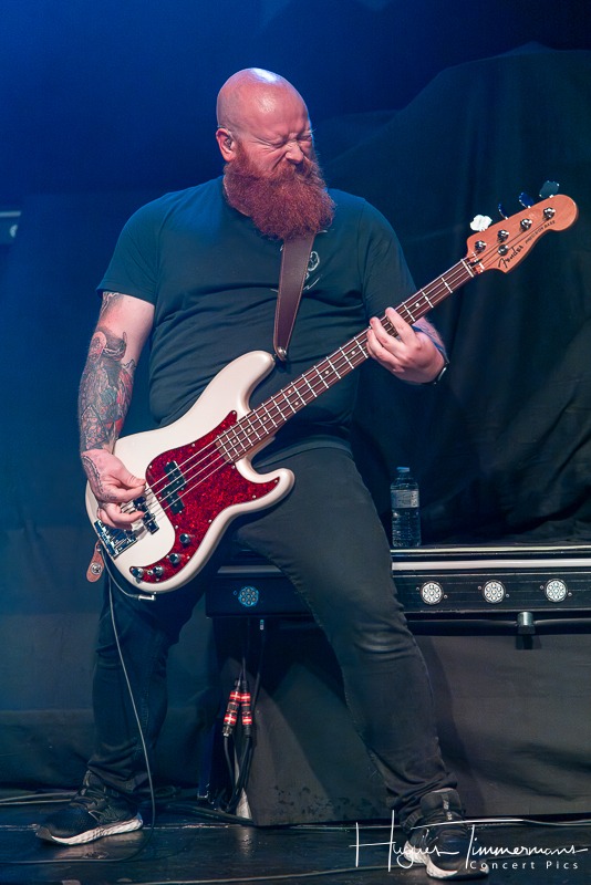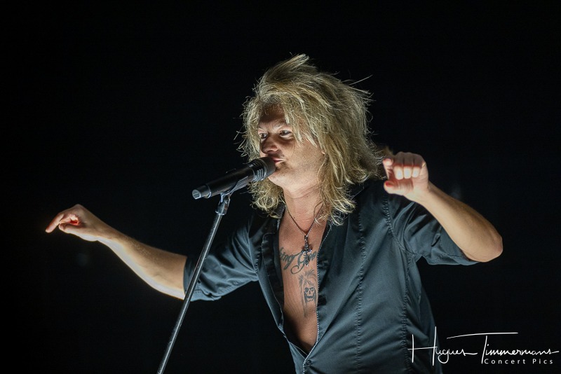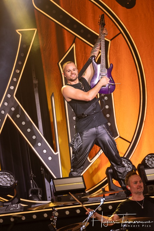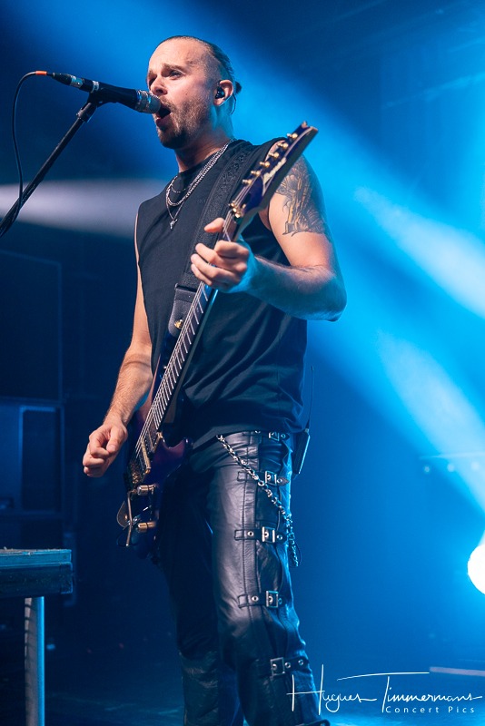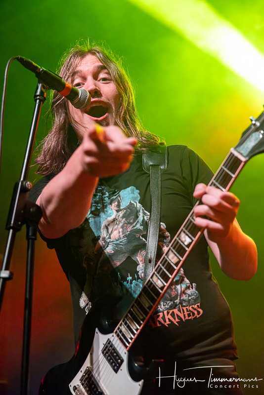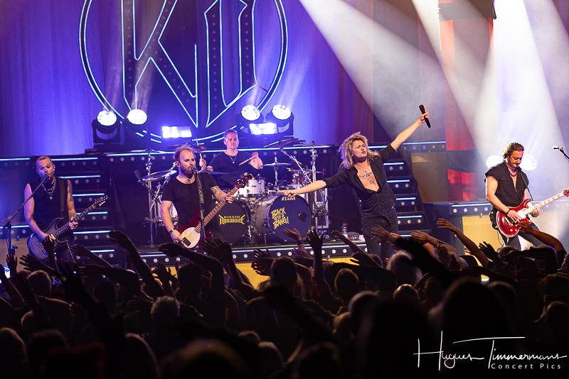 La salle n’est remplie qu’à 65-70%, mais l’ambiance est là. Les deux premiers groupes ont magnifiquement chauffé le public. Quand les lumières s’éteignent dans la salle, on voit apparaître les musiciens sur scène dans un superbe décor, magnifiquement mis en lumière. Le quintet KD se compose toujours de ses membres d’origine, à l’exception du batteur. L’on retrouve donc Andreas Braun et Jim Müller aux guitares, le charismatique Hannes Braun au chant,Steffen Haile à la basse et Sebastian Berg qui remplace Andreas Schnitzer à la batterie depuis 2021. Sur scène, le groupe savoure l’accueil enthousiaste que lui réserve le public belge qui, s’il n’a peut-être pas été le plus nombreux de la tournée, fait néanmoins partie des plus réactifs et brille par sa participation enthousiaste. Les métallurgistes teutons semblent réellement émus par l’accueil qui leur est réservé et se donnent à fond pour remercier le public.