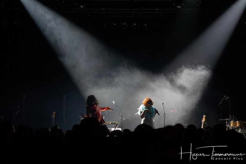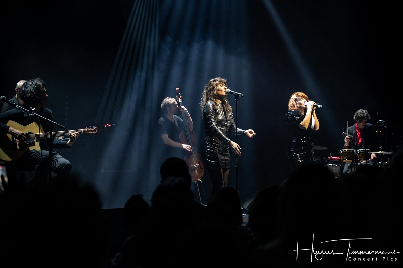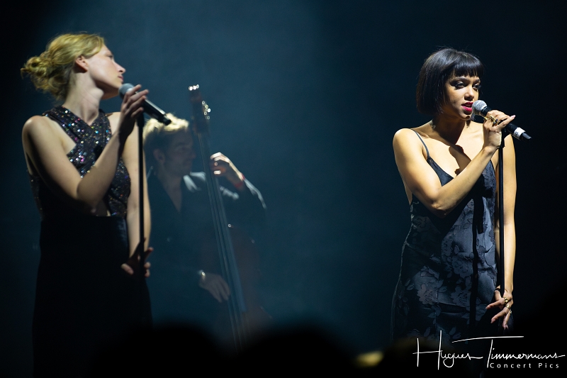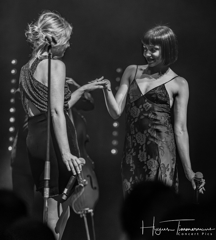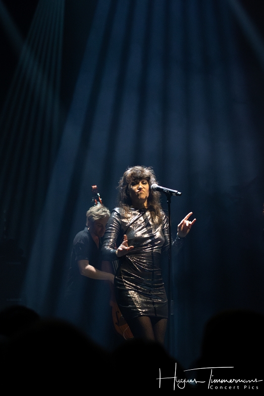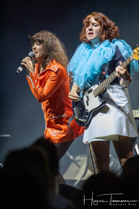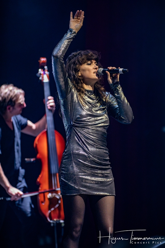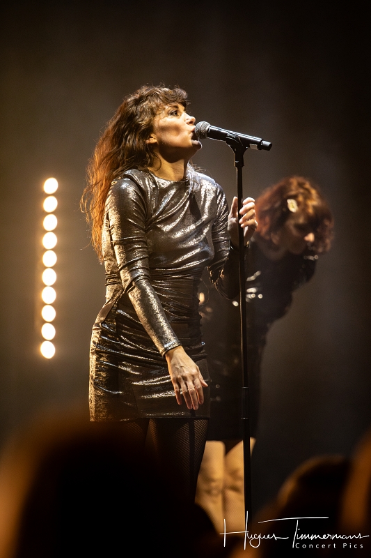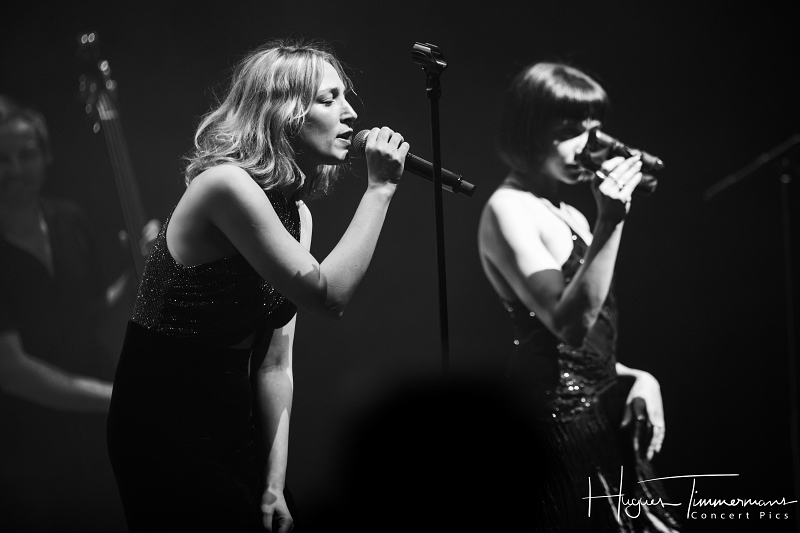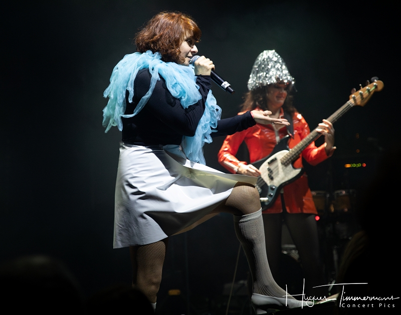 Quatre instrumentistes (batterie, guitare, claviers et contrebasse) vont fournir l’écrin musical de la soirée. C’est au milieu d’eux qu’entre en scène la talentueuse Marine Quéméré au son des premières notes d’une superbe version de « Love Will Tear Us Apart » (2004) de Joy Division. Marine est ensuite rejointe par Alonya pour une version magistrale du « People Are People » (2024) de Depeche Mode. Dans la suite du programme, le public du Cirque Royal a droit à une belle liste de tubes tels que « Only You » (2024) de Yazoo, « Making Plans For Nigel » (2004) de XTC, « This Is Not A Love Song » (2004) de Public Image Ltd, « Girls On Film » (2024) de Duran Duran, « What I Like Most About You is Your Girlfriend » (2024) de The Specials, « A Forest » (2004) de The Cure, « Teenage Kicks » (2004) de The Undertones, « Should I Stay or Should I Go » (2024) de The Clash et une version gigantesque de « Shout » (2024) de Tears For Fears. Pendant ces dix premiers titres, il est frappant de constater comme l’alchimie est parfaite entre le style imprimé aux titres revisités et les voix des deux interprètes, parfaitement complémentaires. Et c’est là sans doute la grande force de la formation française. Sans parler de leurs qualités de danseuses et de leur jeu scénique.