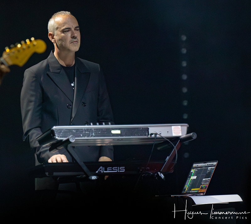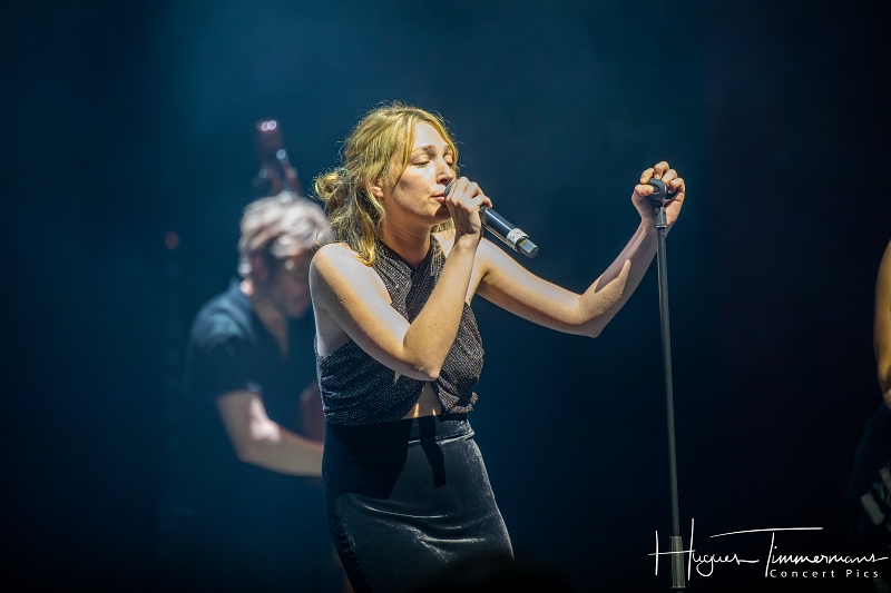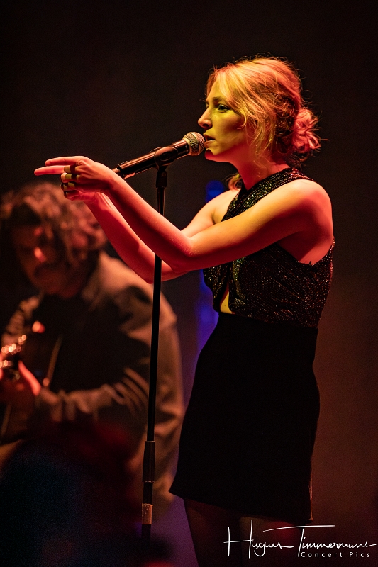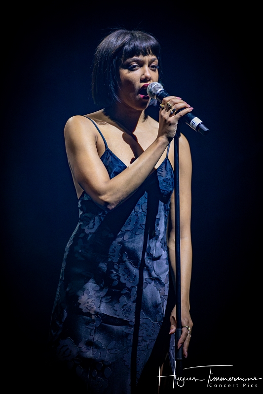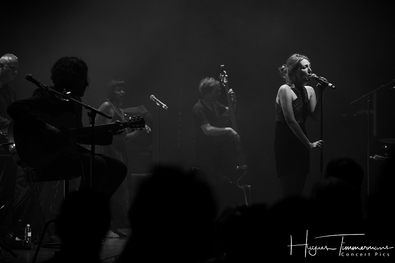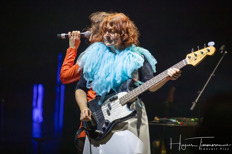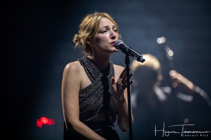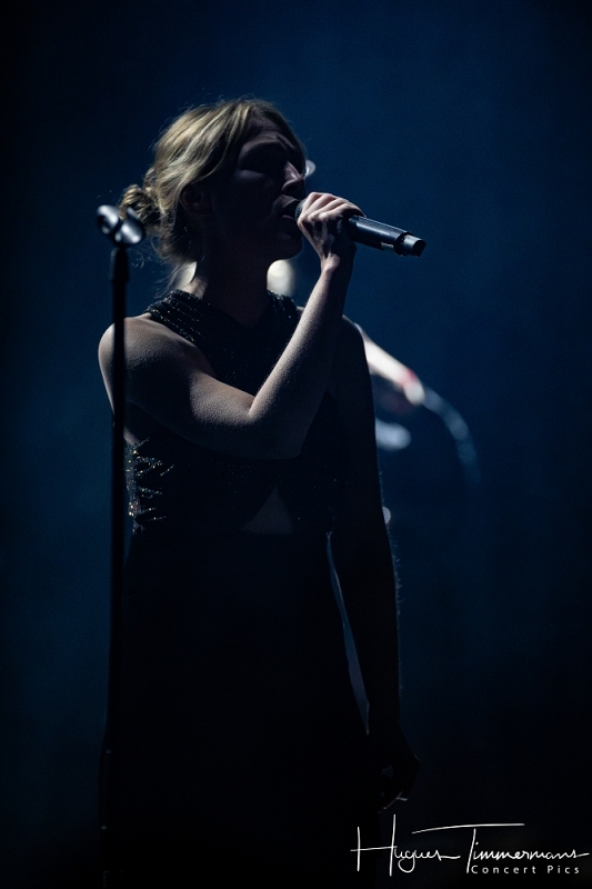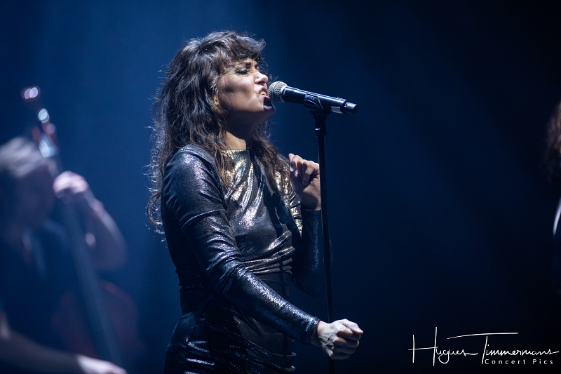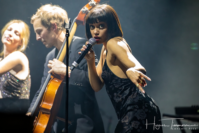Quatre instrumentistes (batterie, guitare, claviers et contrebasse) vont fournir l’écrin musical de la soirée. C’est au milieu d’eux qu’entre en scène la talentueuse Marine Quéméré au son des premières notes d’une superbe version de « Love Will Tear Us Apart » (2004) de Joy Division. Marine est ensuite rejointe par Alonya pour une version magistrale du « People Are People » (2024) de Depeche Mode. Dans la suite du programme, le public du Cirque Royal a droit à une belle liste de tubes tels que « Only You » (2024) de Yazoo, « Making Plans For Nigel » (2004) de XTC, « This Is Not A Love Song » (2004) de Public Image Ltd, « Girls On Film » (2024) de Duran Duran, « What I Like Most About You is Your Girlfriend » (2024) de The Specials, « A Forest » (2004) de The Cure, « Teenage Kicks » (2004) de The Undertones, « Should I Stay or Should I Go » (2024) de The Clash et une version gigantesque de « Shout » (2024) de Tears For Fears. Pendant ces dix premiers titres, il est frappant de constater comme l’alchimie est parfaite entre le style imprimé aux titres revisités et les voix des deux interprètes, parfaitement complémentaires. Et c’est là sans doute la grande force de la formation française. Sans parler de leurs qualités de danseuses et de leur jeu scénique.
