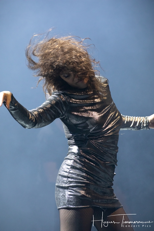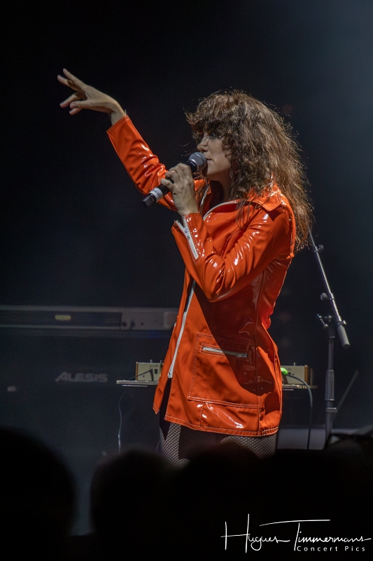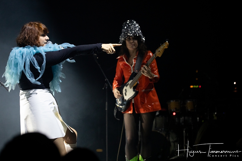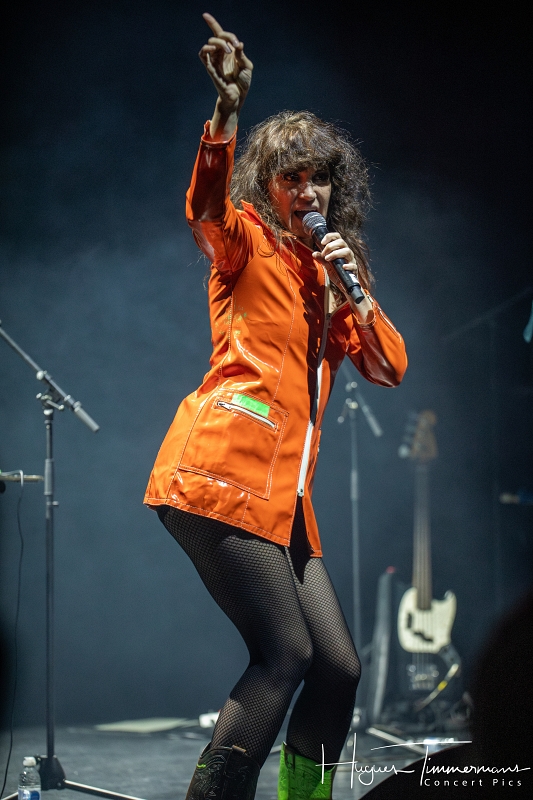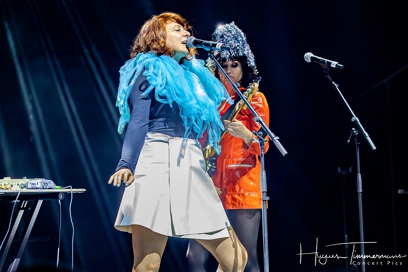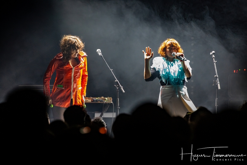19h20: les portes du Cirque sont ouvertes et le public commence à arriver. Quelques minutes plus tard, la file devient de plus en plus dense. Il faut dire que le coup d’envoi de la soirée est annoncé à 20h00 précises. C’est pourtant avec quelques petites minutes de retard que les lumières s’éteignent et que l’on commence à percevoir une ambiance assez électro. Lentement, une lumière diffuse gagne petit à petit en intensité pour saluer l’entrée en scène des deux protagonistes de Kill The Pain. Deux femme vêtues de manière assez excentrique, l’une en jupe courte blanche, bas blancs et chaussures blanches, pull bleu foncé à longues manches et une espèce de gros col boa bleu ciel, l’autre coiffée d’un chapeau conique couvert de fines lamelles argentées souples et d’un imper rouge avec des bottes vert pomme. Il me faut quelques secondes pour réaliser que ces dames sont en réalité la Française Mélanie Pain et l’Australienne Phoebe Killdeer, deux vocalistes iconiques de la tête d’affiche de la soirée.