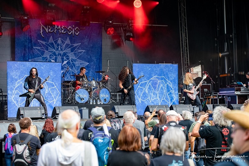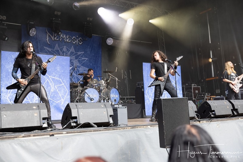 La météo n’est pas aussi estivale que lors de l’édition de l’an passé, mais le soleil fera malgré tout quelques apparitions en cours d’après-midi. Une fois les formalités d’inscription accomplies auprès de la sympathique équipe de bénévoles à l’entrée, nous revoilà au pied du château de la princesse d’Arenberg à Raismes pour assister à l’édition 2024 de ce festival très prisé des amateurs de hard rock. Le coup d’envoi de la première journée a été donné avant notre arrivée par les régionaux de l’étape, à savoir le trio lillois Deluxe Renegades dont nous avons hélas manqué la prestation, mais que nous tenions à citer malgré tout dans notre compte rendu. En déballant le matériel photo, nous écoutons Nemesis HP, groupe de hard rock/heavy metal fondé par les frères Yannis et Liam Geenens, qui compte à son actif un premier album intitulé « Lions » (2021) pour lequel le groupe a bénéficié de la participation d’un guest prestigieux en la personne de Chris Holmes (ex Wasp). Au menu, une sélection de titres de l’unique album, dont l’excellent « You’ve got to regret« . Le quatuor déroule des compositions de style hard rock fortement influencé par les grands noms des années 80, en faisant preuve d’une belle maîtrise. Voilà qui augure bien pour la suite!