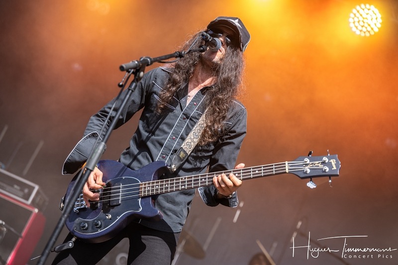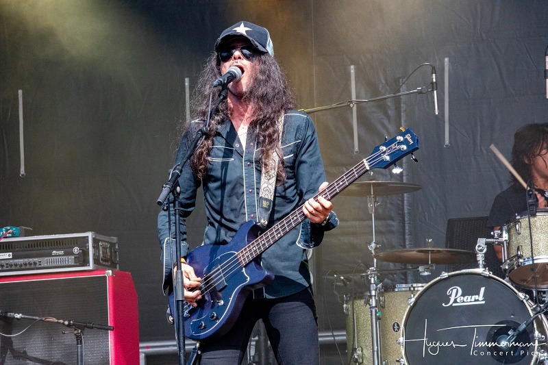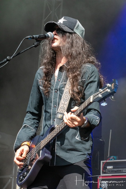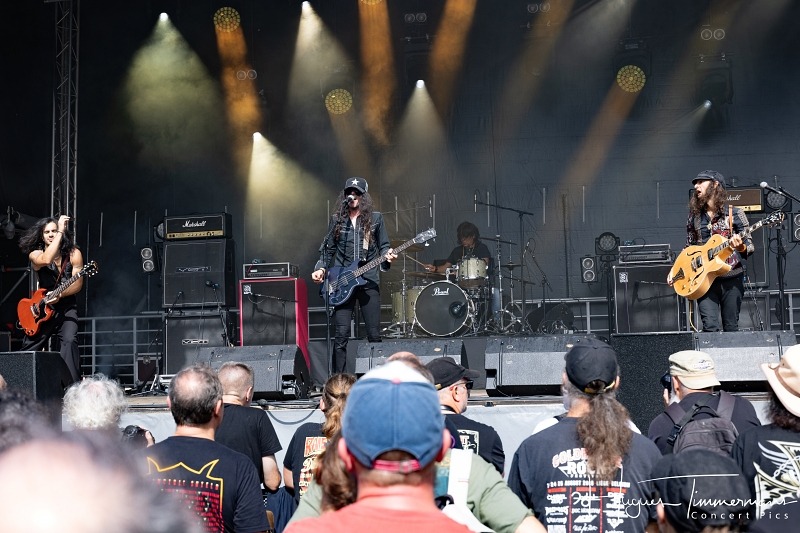 A peine le temps de faire un premier tour rapide des stands et foodtrucks en saluant les nombreux visages connus déjà présents dans la place, qu’il est déjà temps de découvrir l’univers musical de la formation transalpine Small Jackets. Créé en 2000 sous la forme d’un duo réunissant le batteur Danny Savanas et le chanteur-guitariste Lu Silver, le groupe a connu plusieurs changements d’effectif. Après un premier album très réussi sorti en mars 2004 (“Play at High Level”), le groupe démarre sa carrière de manière tonitruante et enchaine les albums: “Walking the Boogie” (2006),“Cheap Tequila” (2009) et “IV” (2013) . Suivra une période de vaches maigres malgré un concert mémorable à Milan en 2017. Il faudra attendre jusqu’à la mi-décembre 2021 pour assister au come-back du groupe avec la sortie de “Just Like This!”. C’est dire si l’accouchement aura été difficile. Mais le résultat est à la hauteur des attentes. Sur scène, Mark Oak (chant et basse), Eddy Current (guitare et choeurs), Danny Savanas (batterie, percussions et choeurs) et Phil Baychans (guitare et choeurs) distillent un hard rock énergique et véloce, assez accrocheur. Seul petit bémol: certains passages de « jam » tirent un peu en longueur. Mais c’est assurément un groupe dont la musique ne manque pas d’attrait. Les fans auront apprécié de les retrouver pour un set d’une cinquantaine de minutes qui passe en revue les principales pépites du répertoire des Small Jackets.