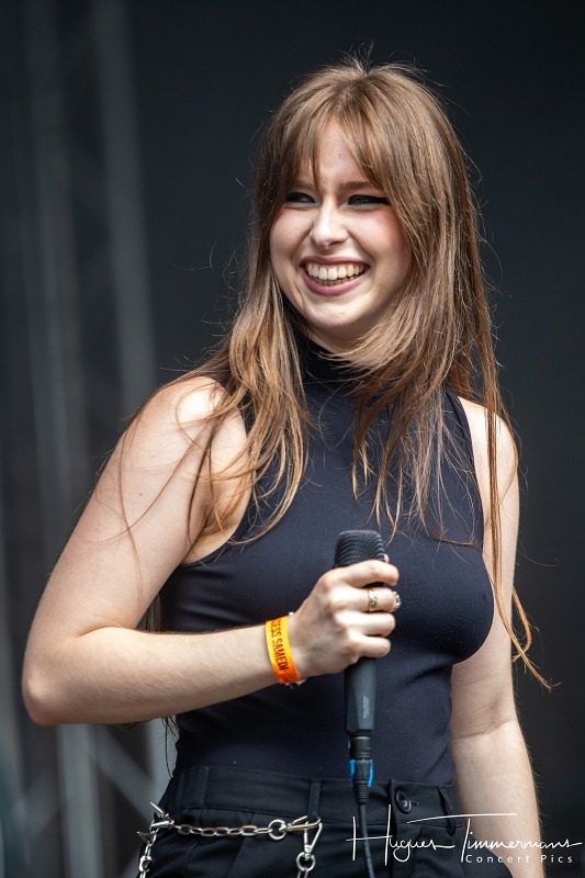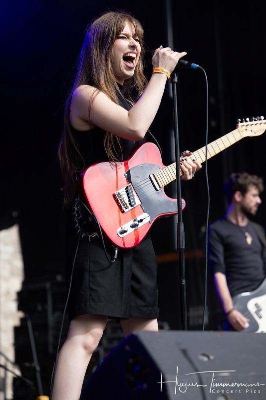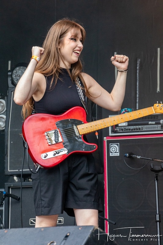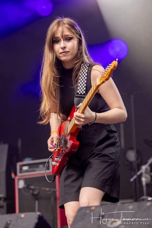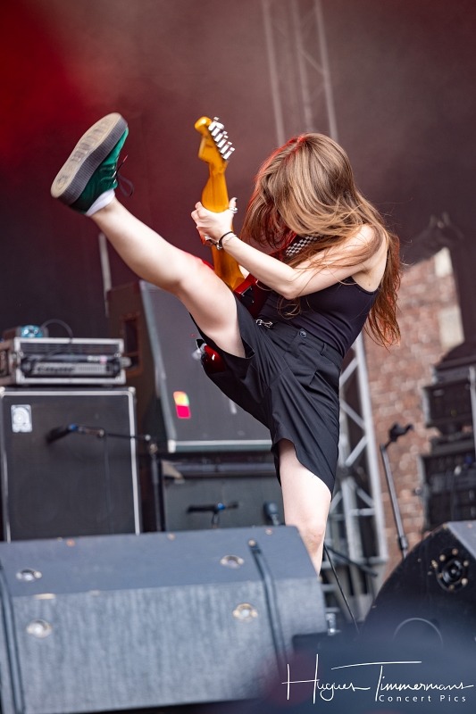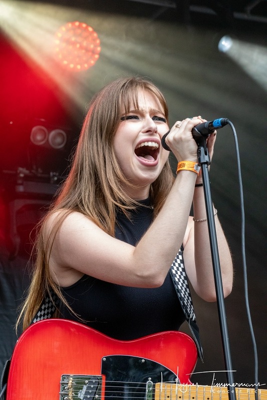 L’artiste suivante est une nouvelle venue: Kim Melville. Elle est jeune, talentueuse, hyper sympa et sait y faire sur scène. De fait, avec un papa guitariste, une maman chorégraphe et une grand-mère pianiste, la pomme n’est pas tombée loin de l’arbre. Après avoir étudié le piano, Kim se met à la guitare et fait ses premiers pas sur YouTube et Instagram. Pour la petite histoire, Manu Lanvin lui a offert une guitare Melody Maker customisée, plaçant ainsi la jeune artiste sur les traces de la légendaire Joan Jett. Sur scène, Kim propose un univers teinté de rock, de glam, de pop et même d’influences métalliques. Nous avions eu l’occasion de la découvrir sur la scène d’un festival dans le sud de la France où elle se produisait avant Laura Cox. Elle nous avait déjà fait excellente impression et c’est un réel bonheur de la revoir à Raismes. Elle joue de la guitare et elle chante super bien. Un régal! Accompagnée sur scène par le fabuleux Lucas Melville à la batterie, François Félix à la basse et Frédéric Benne, la belle propose un set composé d’extraits de son EP 5 titres sorti en 2021 et de quelques surprises: « Bitter« , « Blond Loud & Dumb« , « Lost in the Woods« , « 105 Times« , « Asmar« , « One More Chance« , « If I had you« , « Mars » (reprise de Yungblud), « Sinkin’« , « Can’t Sleep« , « Are You Gonna Be My Girl » (reprise de Jet). Voilà en tout cas une artiste pleine de fraîcheur, d’énergie, de talent et d’enthousiasme dont on risque d’entendre parler très bientôt. Son premier album est en préparation et nous sommes déjà impatients de l’entendre!