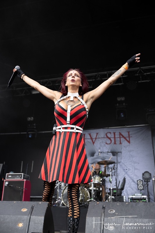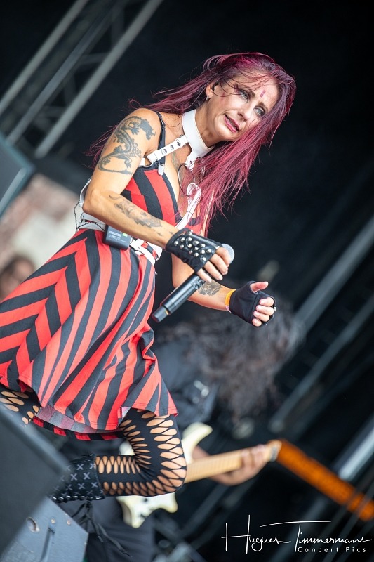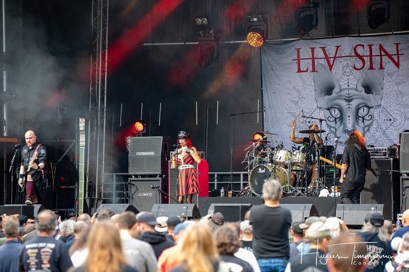 Encore une artiste féminine pour poursuivre. La foule des festivaliers est maintenant plus dense pour accueillir une artiste suédoise dont le nom vous est peut-être familier. Liv Sin s’était en effet fait connaître avec son band Sister Sin que nous avions eu l’occasion de voir sur scène à Bruxelles au défunt festival Road to Rock. Après 13 ans passés au sein de ce groupe suédois, Liv Jagrell a fait le choix d’une carrière solo sous le pseudinyme de Liv Sin. L’artiste compte déjà à son actif 3 albums et 1 EP dans lesquels elle distille un heavy metal plus rapide et plus agressif que celui de son ancien groupe, avec des influences reconnaissables comme celle d’Arch Enemy ou encore Amon Amarth. Bref, c’est couillu et très dynamique. Il faut dire que, vocalement, Liv envoie du lourd et ne ménage pas ses efforts sur scène pour mettre le public dans sa poche à grands coups de headbangings et d’invectives pour harranguer les festivaliers qui répondent présent à l’appel sur fond de riffs massifs et d’une rythmique percutante. C’est stimulant, revigorant, enthousiasmant. Quelle claque!